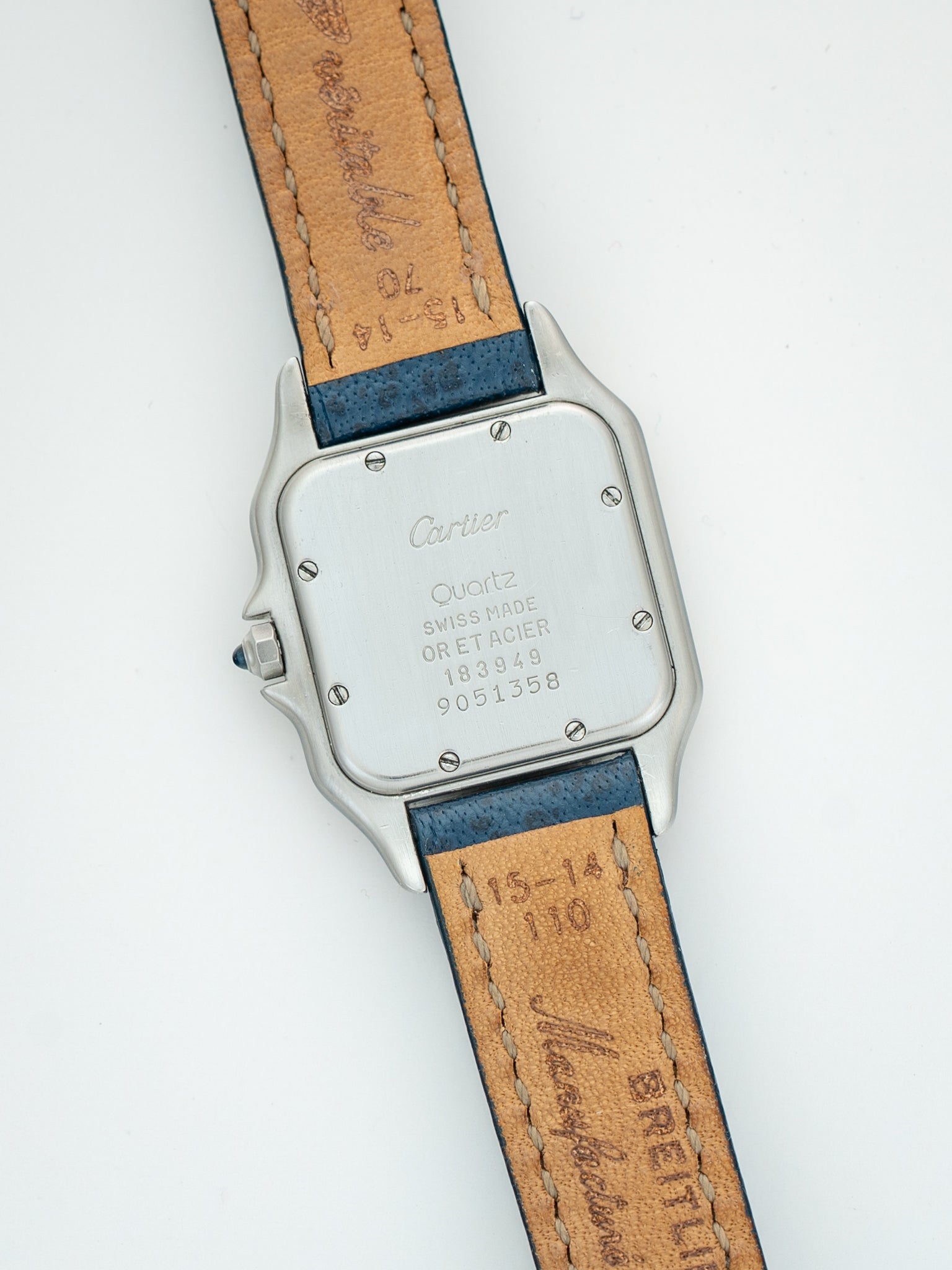 The Cartier Panthère de Cartier, Ref. 183949, is a midsize (27mm), stainless steel and 18k yellow gold watch praised for its versatile design as both a functional timepiece and elegant jewelry. Its quartz movement offers reliable accuracy, while its thin case provide comfort for everyday wear and a sophisticated aesthetic suitable for casual and formal occasions alike.