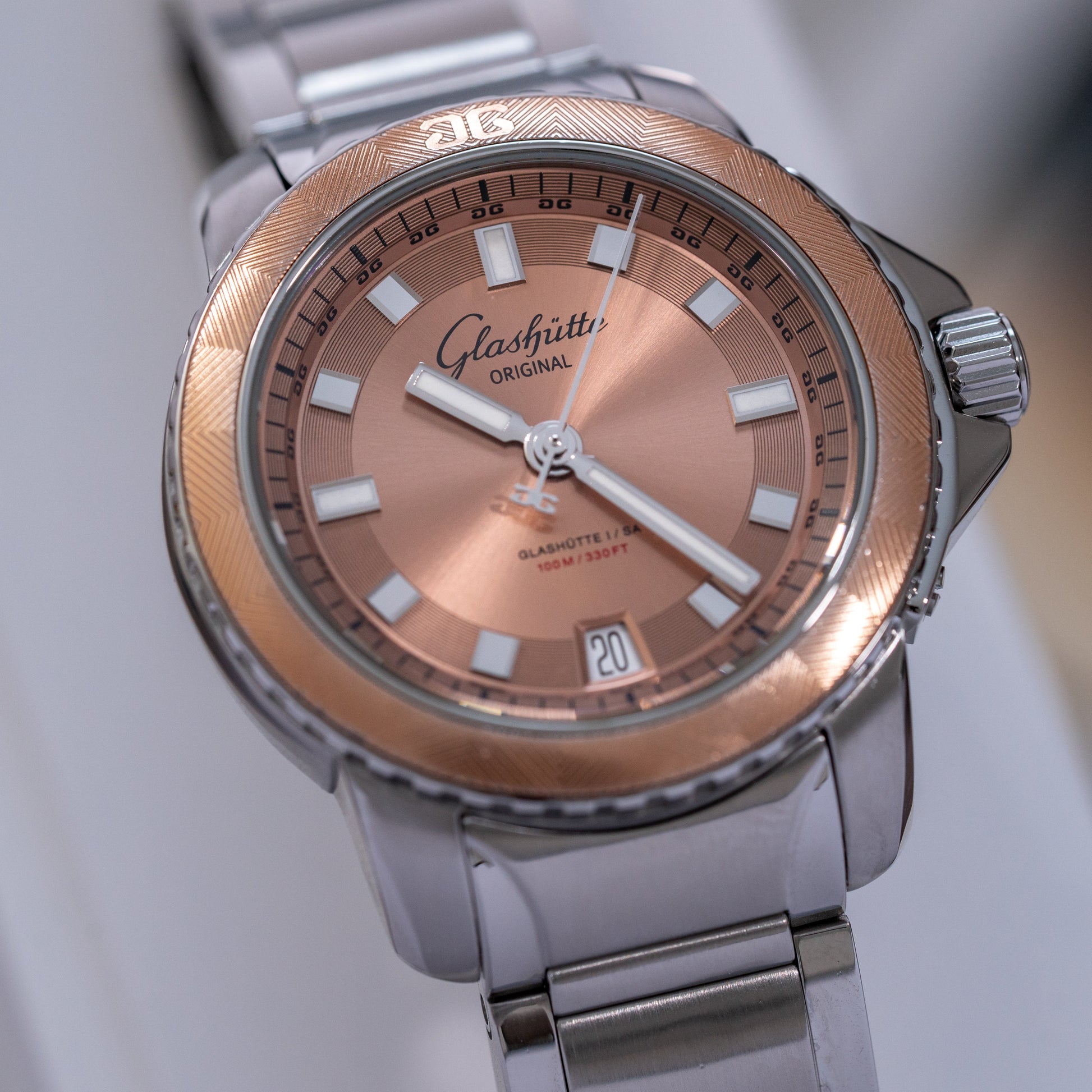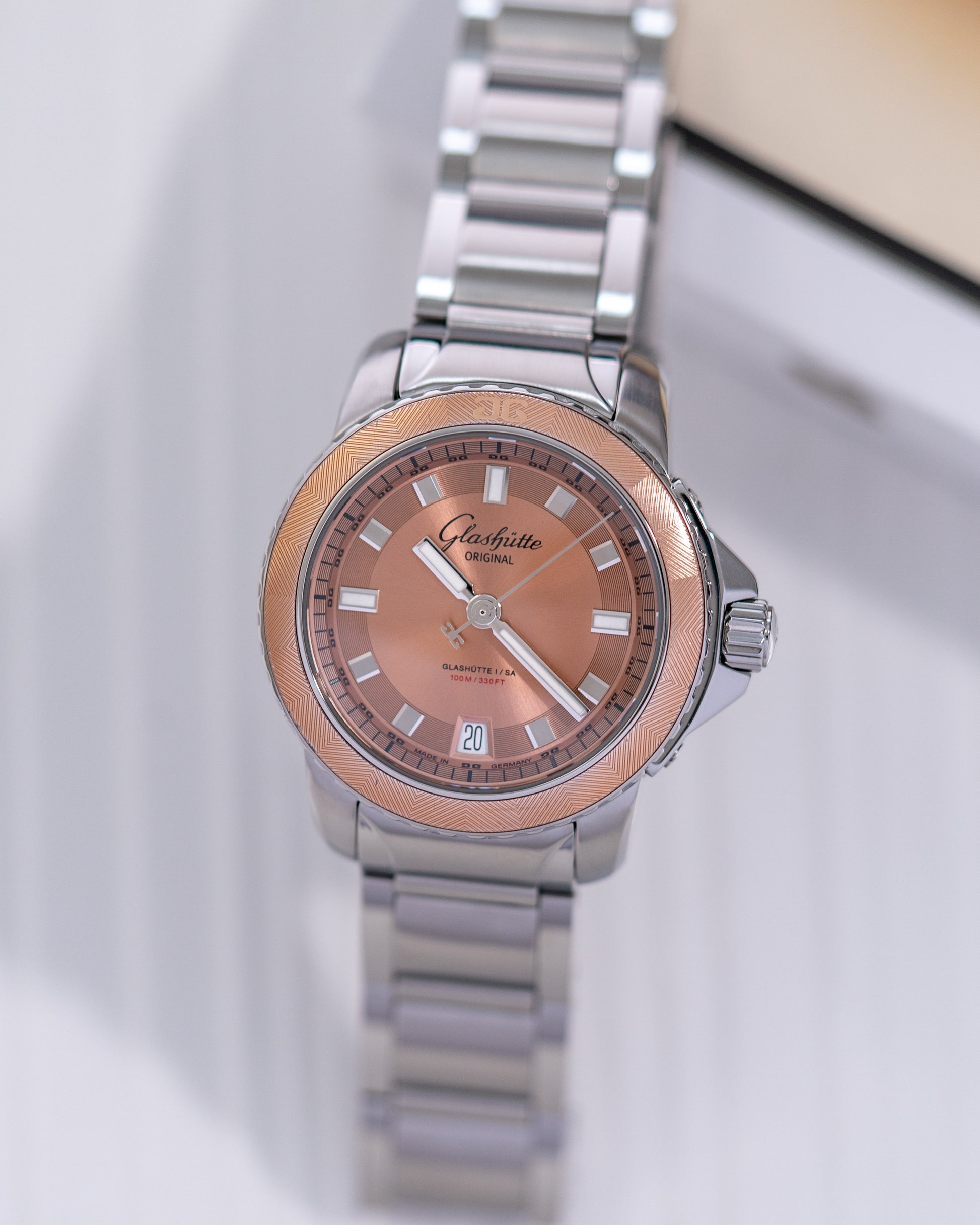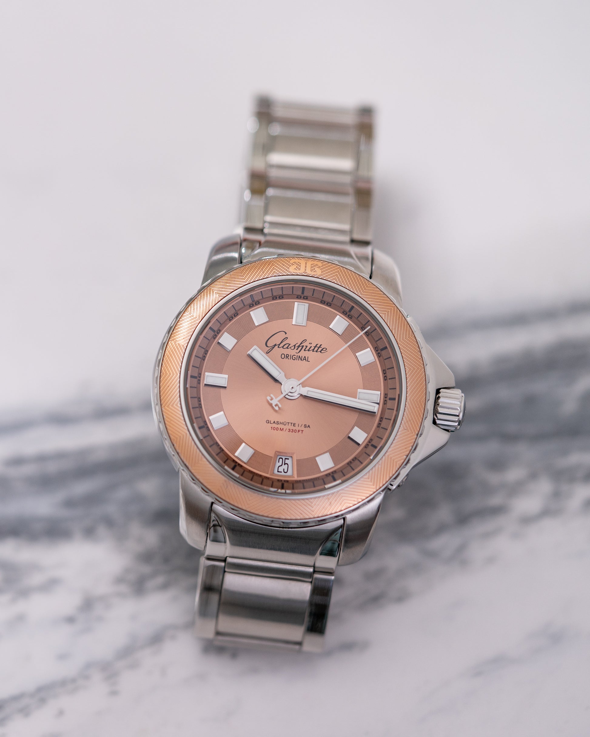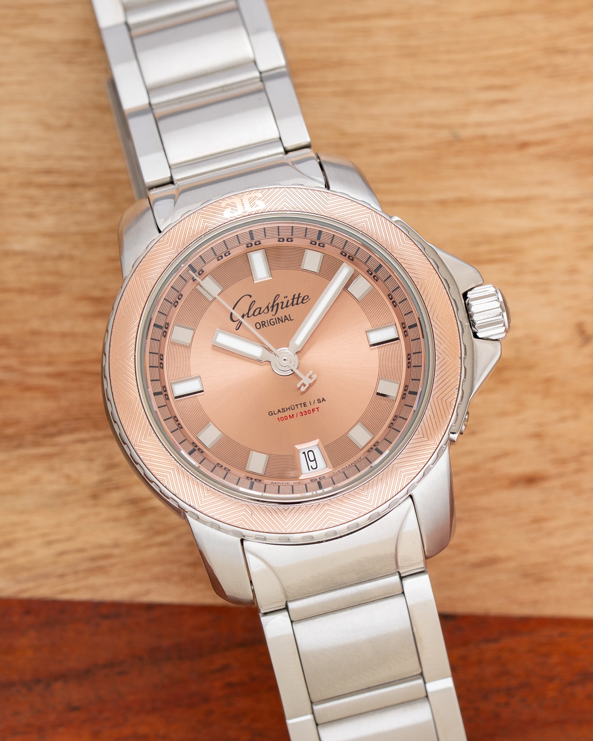 This GO features a beautiful salmon dial with sunburst effect and textured fixed bezel on a 37mm stainless steel case. The watch is powered by in-house GO caliber 39 with 40 hours of power reserve.