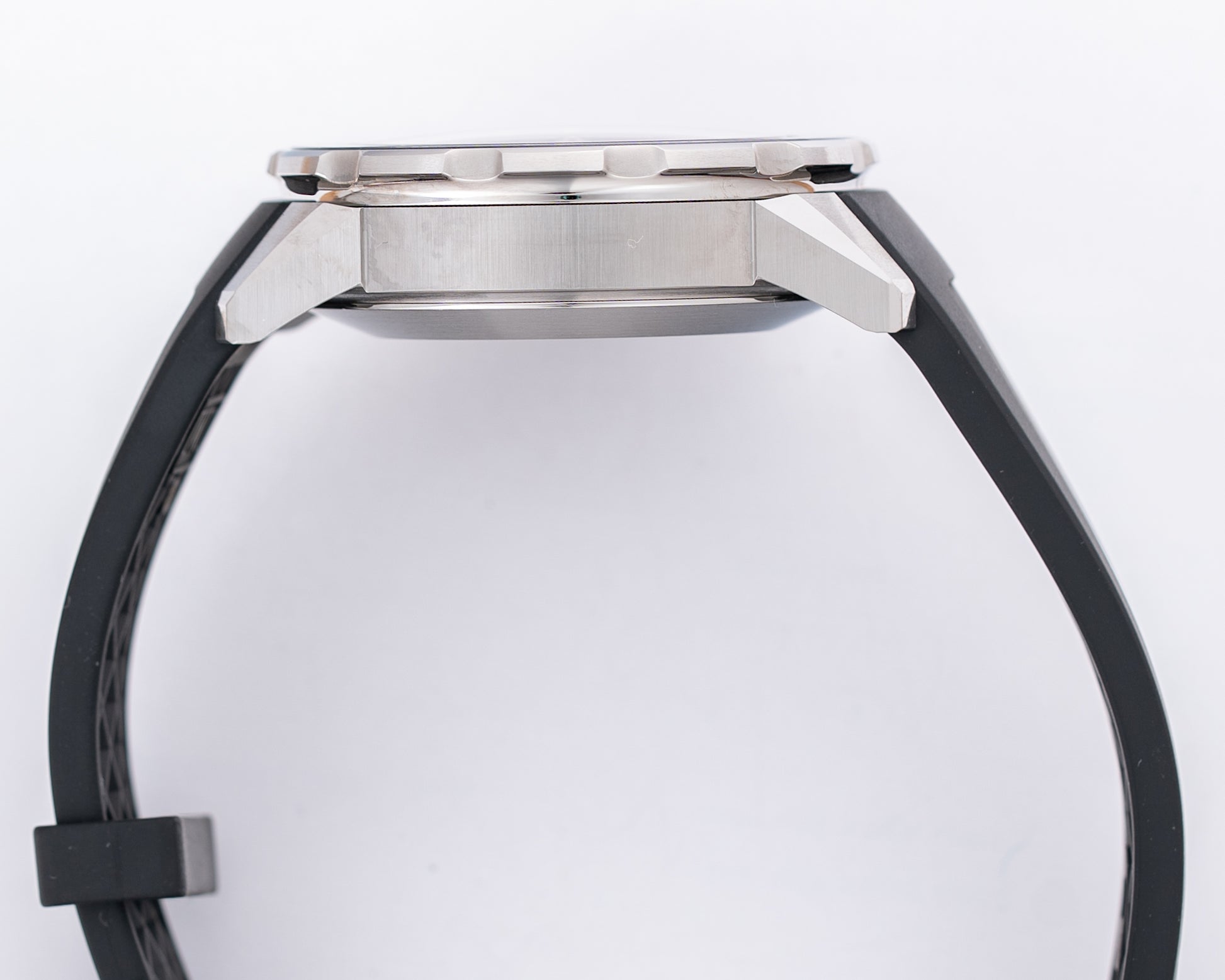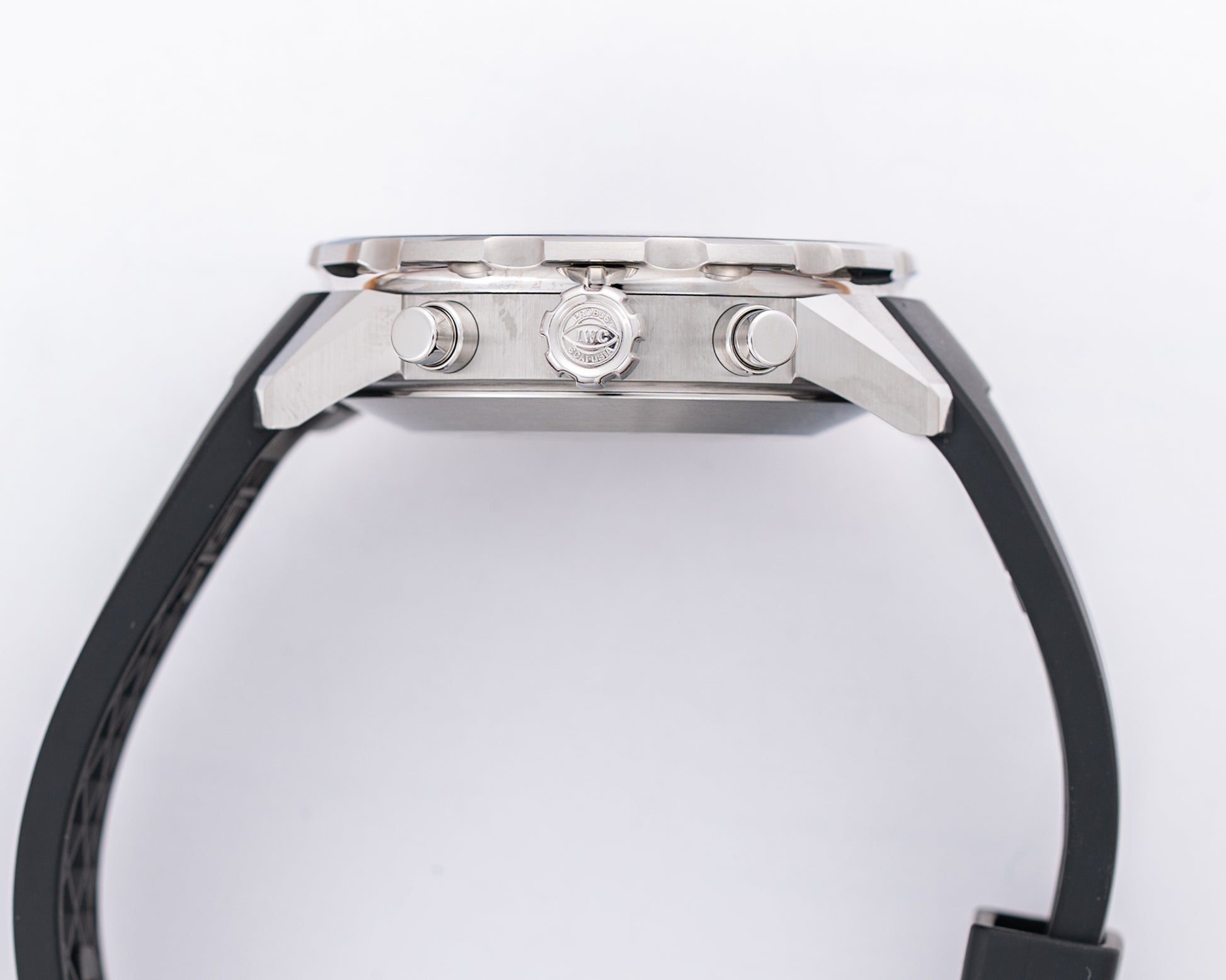 The IWC Aquatimer Chronograph is a robust and sporty dive watch, suitable for both professional and recreational use. It's known for its tool watch aesthetic and comfortable fit and features like a 4mm wide external rotating bezel. While it's a capable diver, it's also versatile enough to be worn in casual settings. The differently coloured arc for the first quarter-hour on the rotating bezel is one of the hallmarks of the Aquatimer models