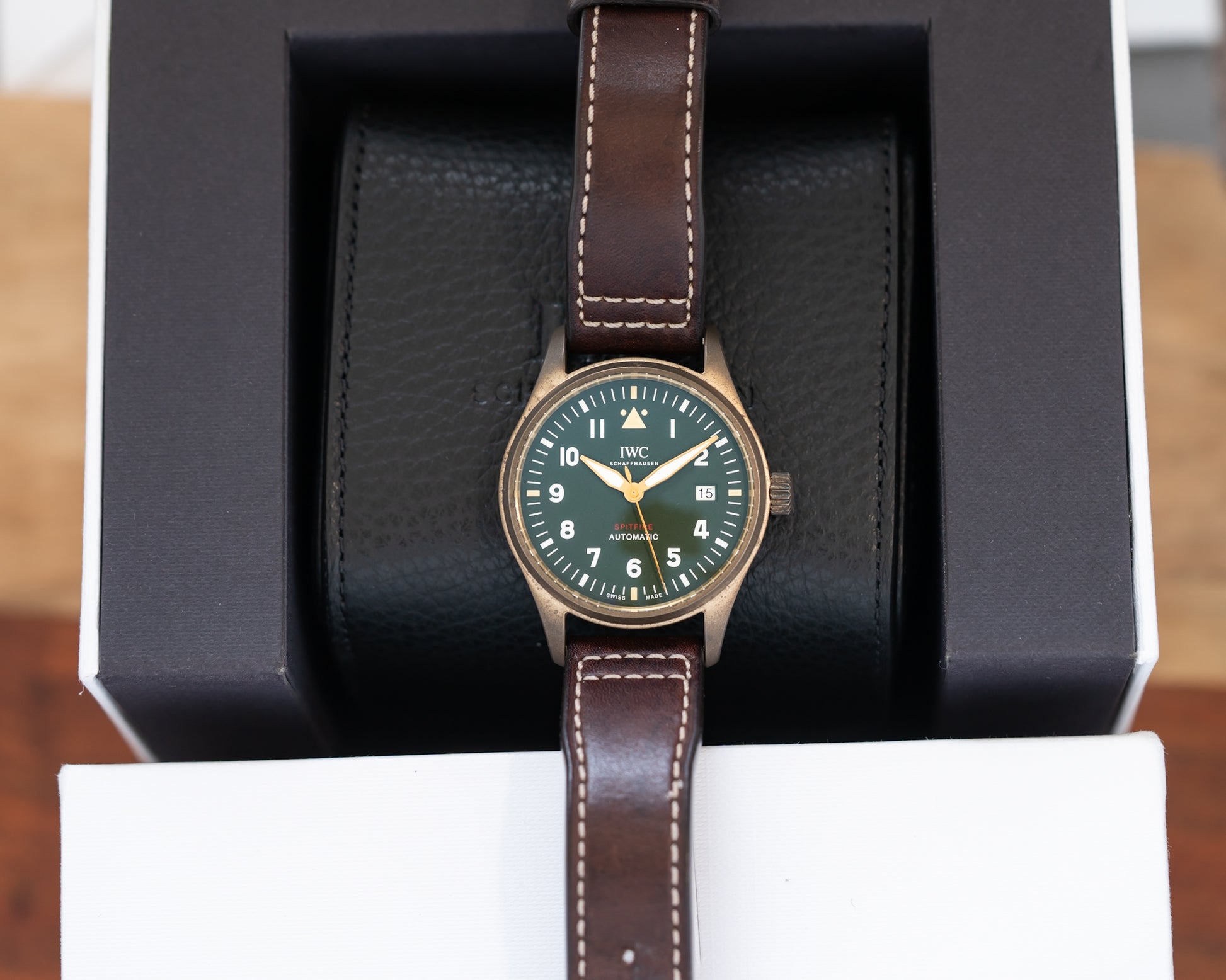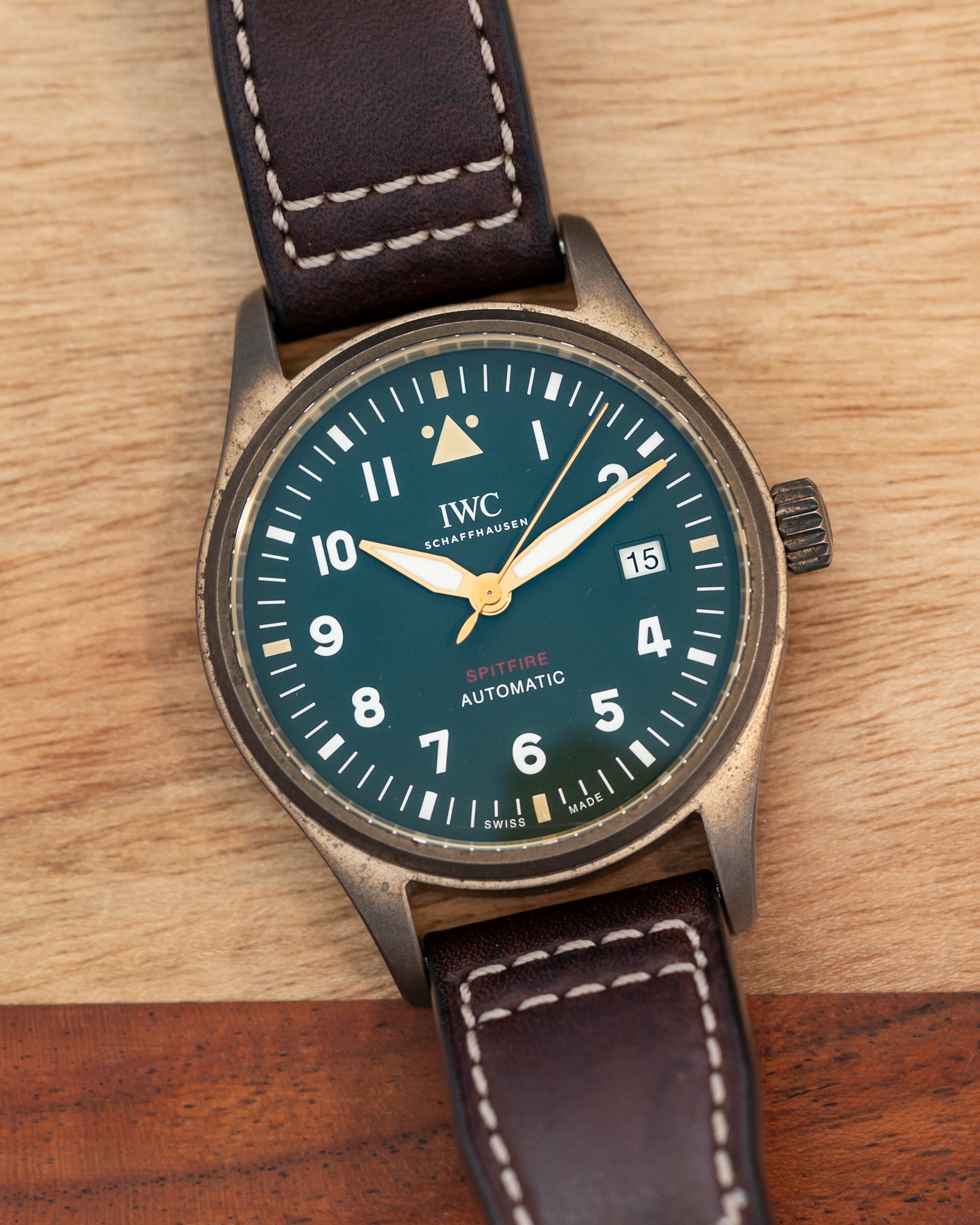 The Pilot's Watch Automatic Spitfire remains true to the purist instrument design of the Mark 11 navigation watch, which was produced from 1948 onward for the British Royal Air Force. The new, IWC-manufactured 32110 calibre is featured for the first time in this functional timepiece. The robust automatic movement has bidirectional pawl-winding that builds up a power reserve of 72 hours. The watch comes in a case measuring an eminently wearable 39 millimetres in diameter. The bronze case, olive green dial and brown calfskin strap imbue it with a unique character. Depending on the use to which it is put, bronze develops a patina in the course of time and darkens in color, giving the Pilot's Watch Automatic Spitfire its own unmistakable character. A soft-iron inner case effectively shields the movement from magnetic fields.