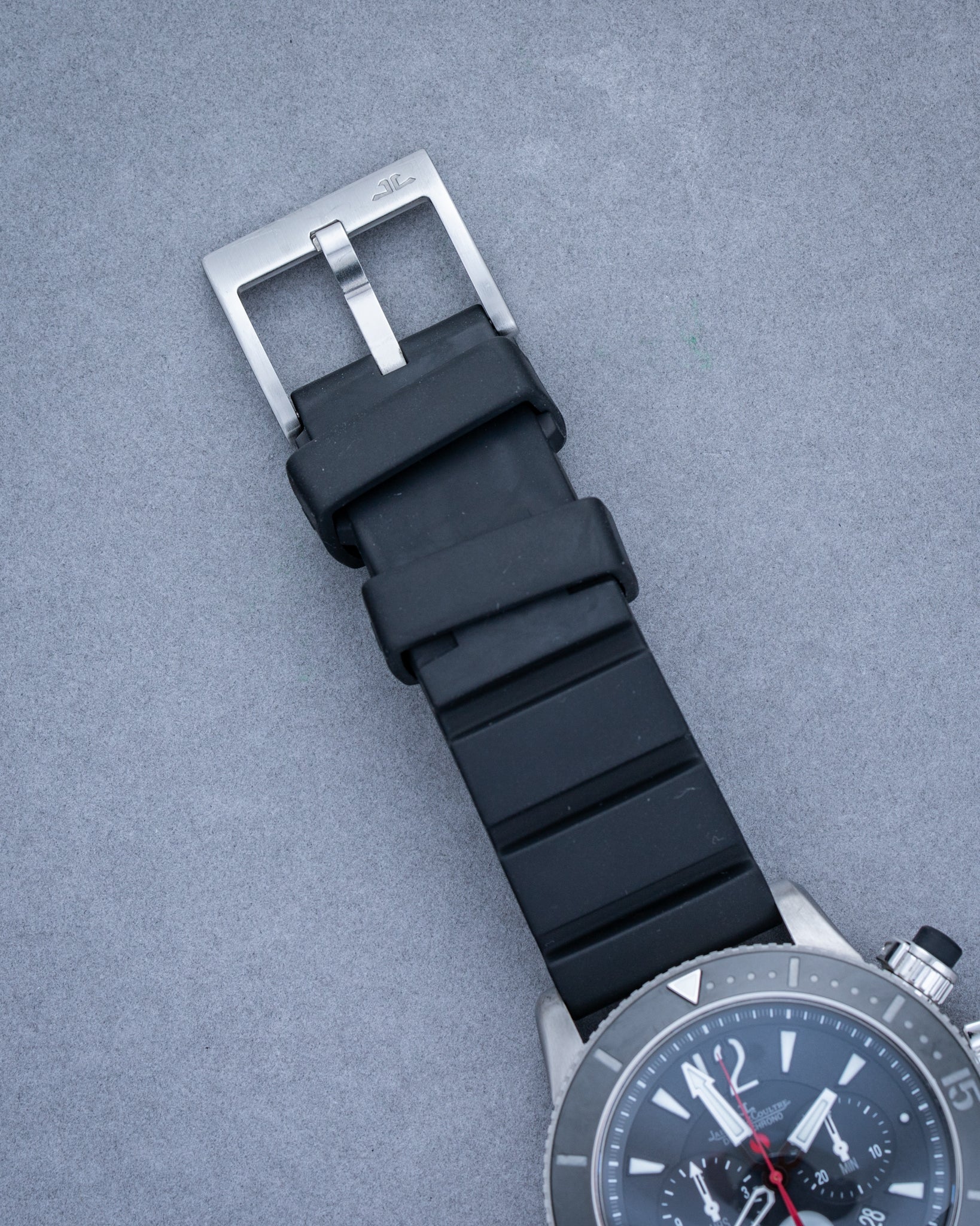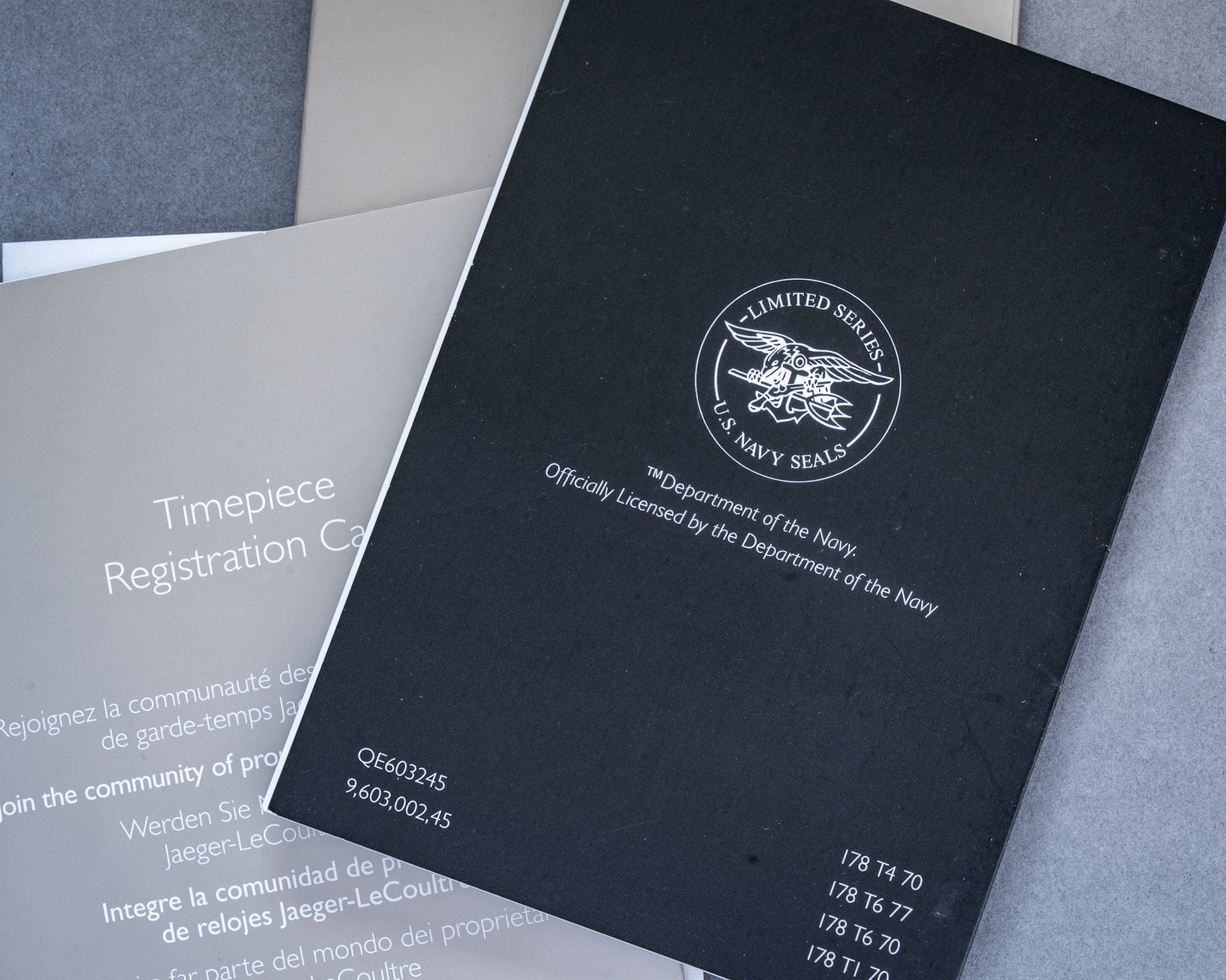 The JLC Diving Chrono GMT Navy SEALs Limited Edition is a luxury tool watch for experienced collectors valuing precision and unique features. The watch is equipped with a high-tech JLC movement with column wheel and vertical clutch, robust grade 5 titanium construction, a fast-acting compressor crown, ceramic bezel insert, and a second time zone with AM/PM indicator. The novel compressor crown system are points of technical excellence not seen in typical dive watches uses a single half-turn to lock or unlock controls, providing quick access while still maintaining 1000m water resistance.