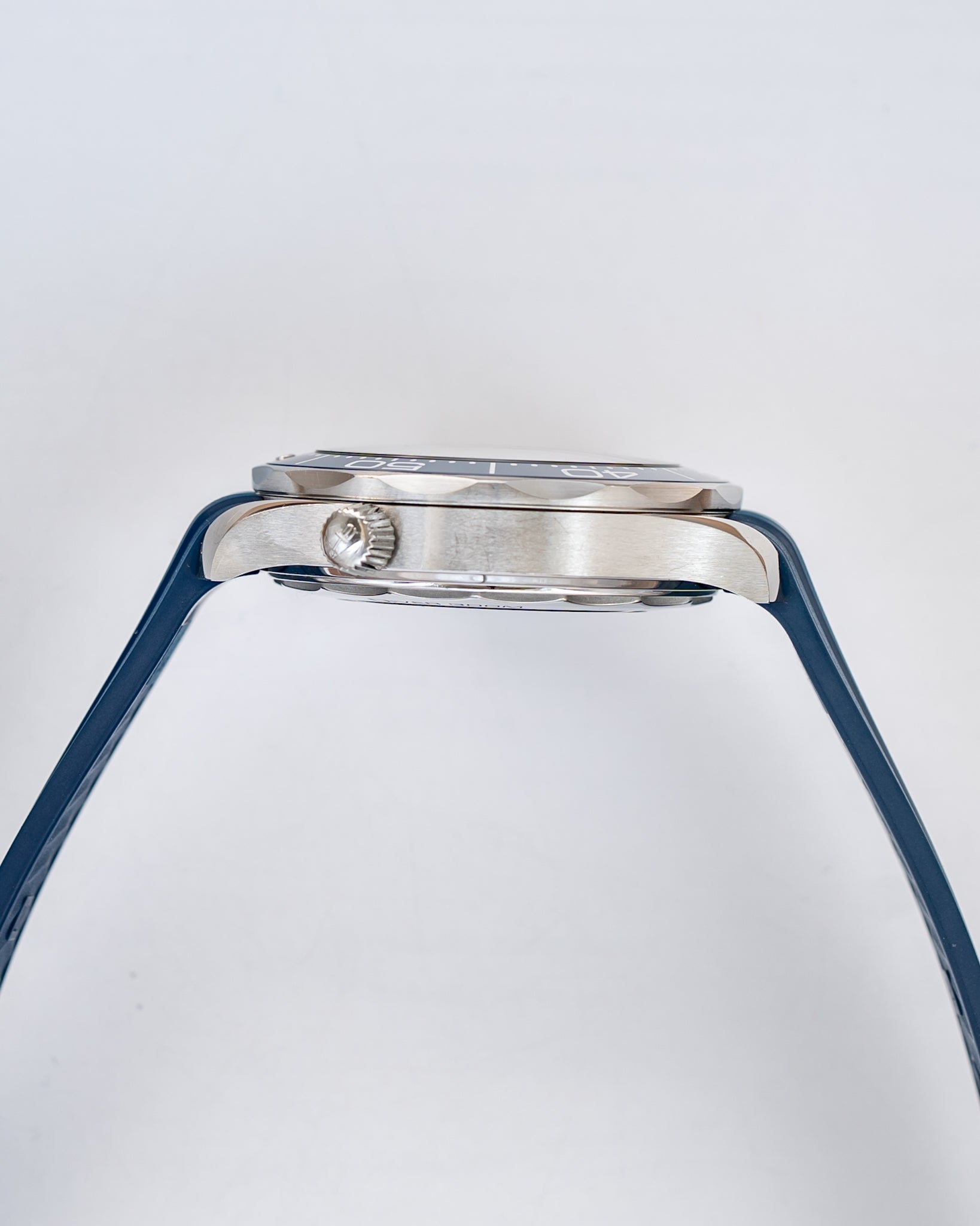 This watch needs no introduction. This watch includes a blue ceramic bezel with a white enamel diving scale. The dial is also polished blue ceramic and features laser-engraved waves and a date window at 6 o’clock. The skeleton hands and raised indexes are rhodium-plated and are filled with white Super-LumiNova. The watch is presented on a blue rubber strap and is driven by the OMEGA Master Chronometer Calibre 8800, which can be seen through the sapphire-crystal on the wave-edged caseback.