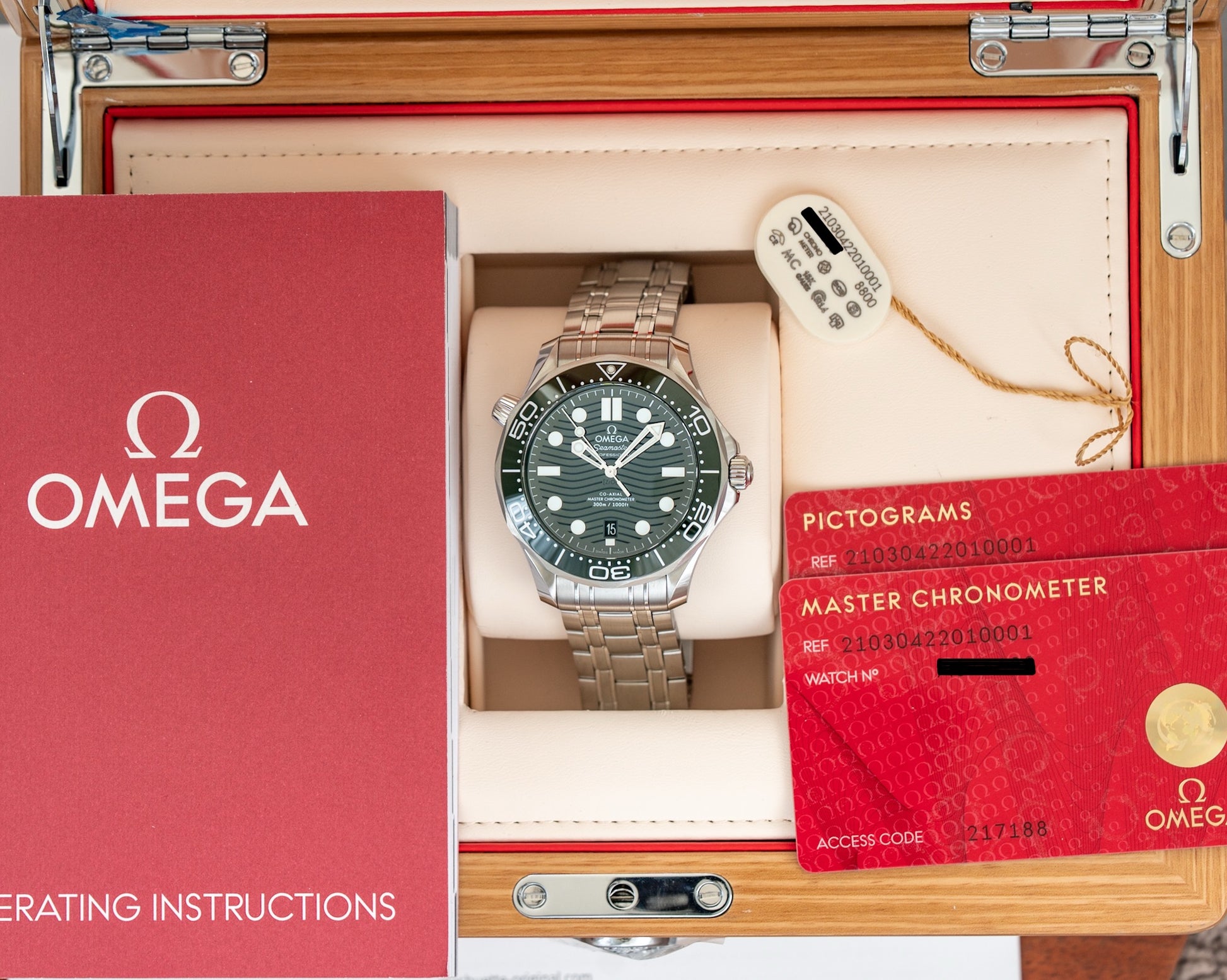 ✔️ Watch on original full link bracelet. Inner and outer box and manual, hang tag, two cards minus warranty card.