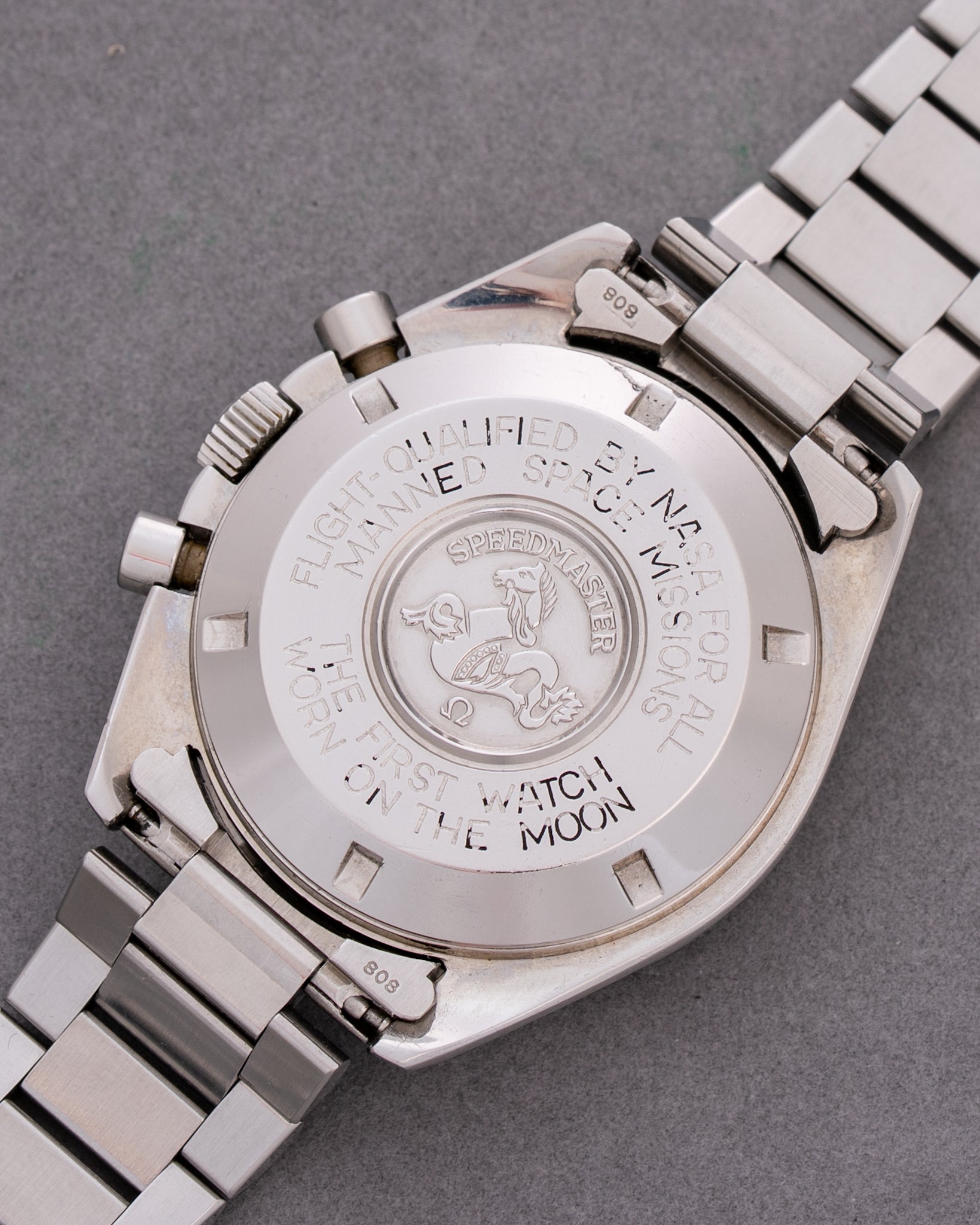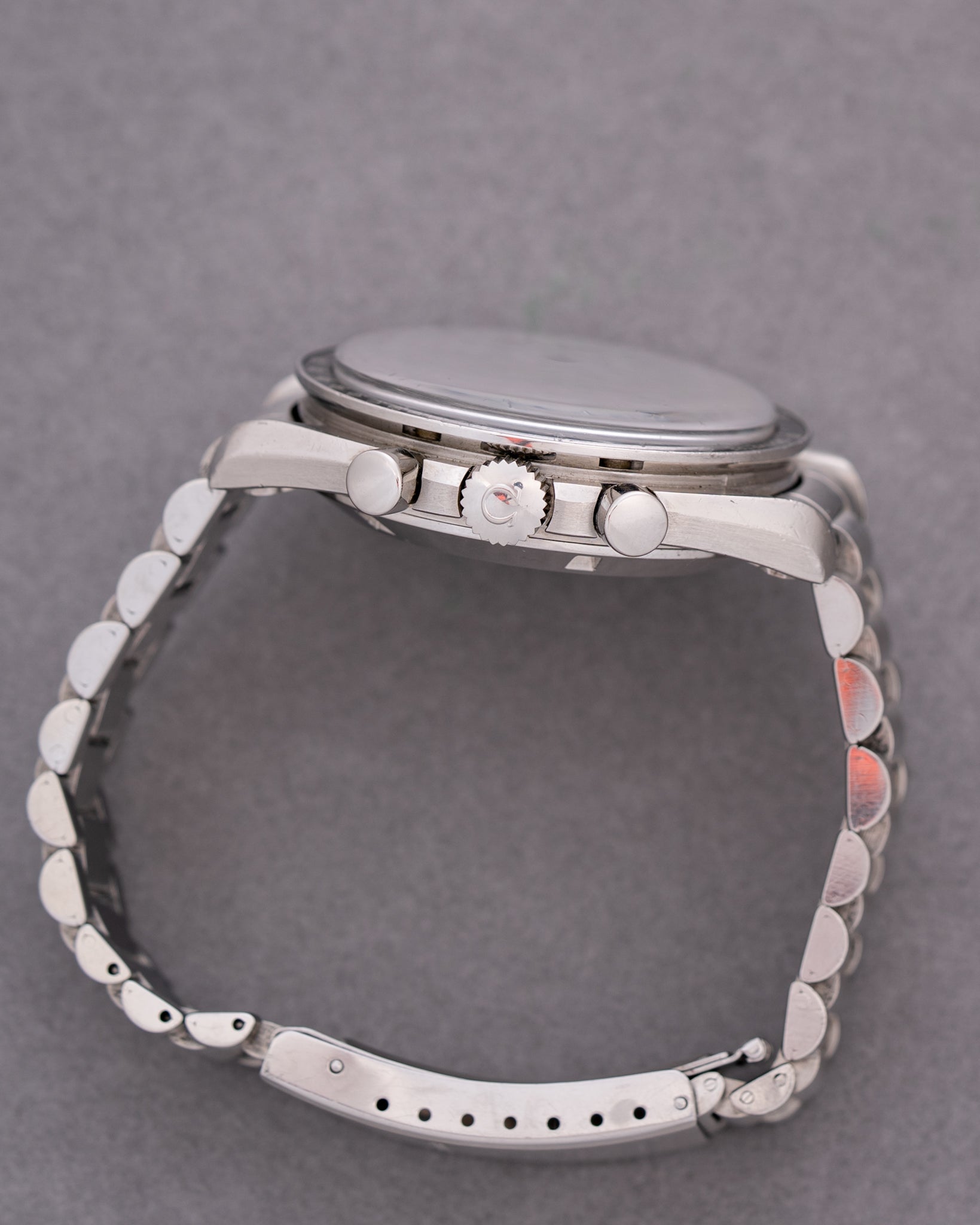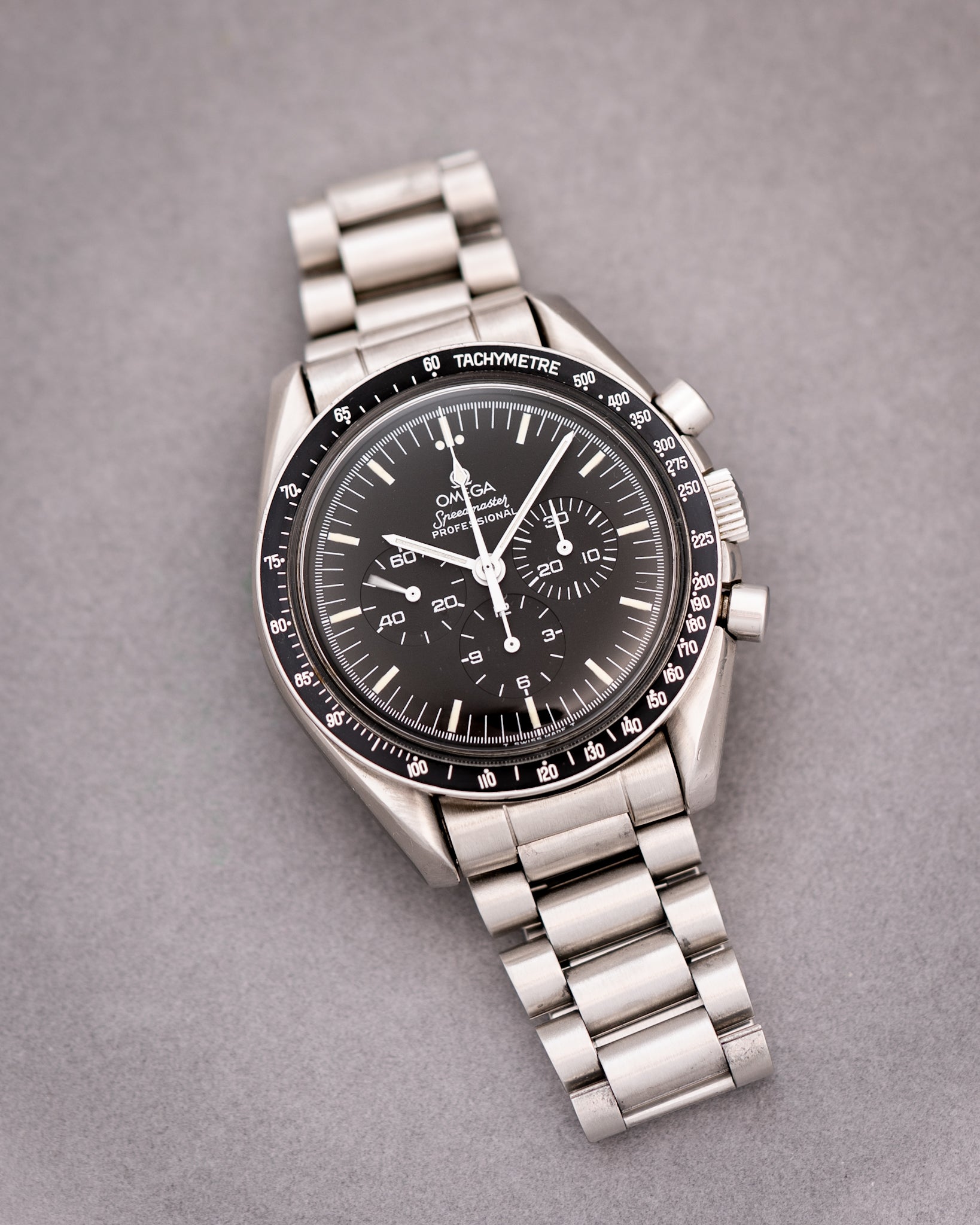 For many enthusiasts, a vintage Omega Speedmaster Professional is the way to go, despite the current Moonwatch ticking a lot of boxes. The Speedmaster Professional 145.022 is a sought-after reference that was in production for a long time (1968–1988). It consisted of several iterations, each with small updates. This one is the non-stepped dial version with the First Watch Worn on the Moon inscription on the caseback and the sought after 1450/808 bracelet.