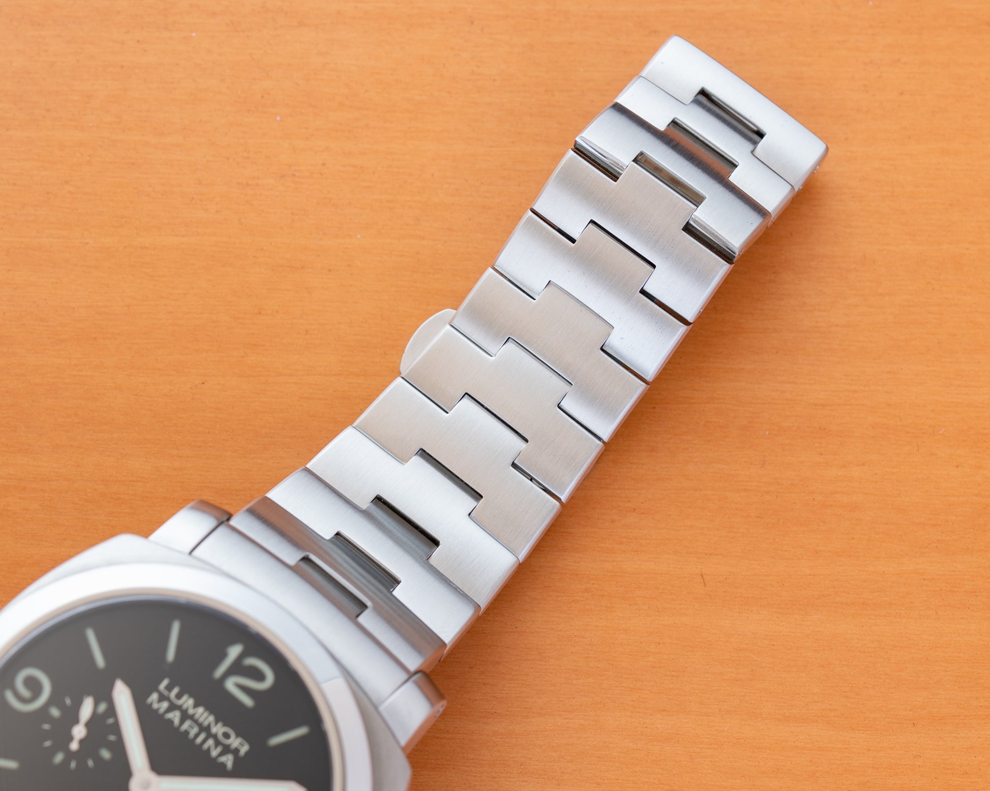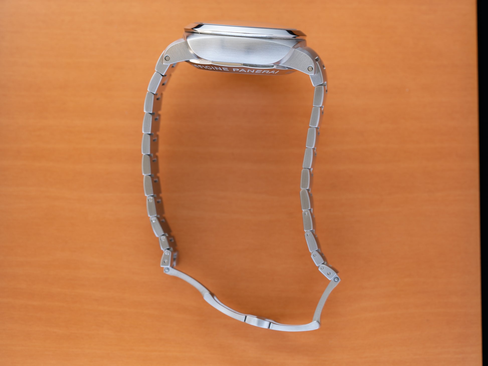 This Panerai is what most people picture when they think of Panerai with its distinctive locking crown-guard system and chunky style. This Luminor 1950 has that iconic, minimalist, legible look that the brand is so admired for with the only difference that it comes not on a strap, but on a matching steel bracelet