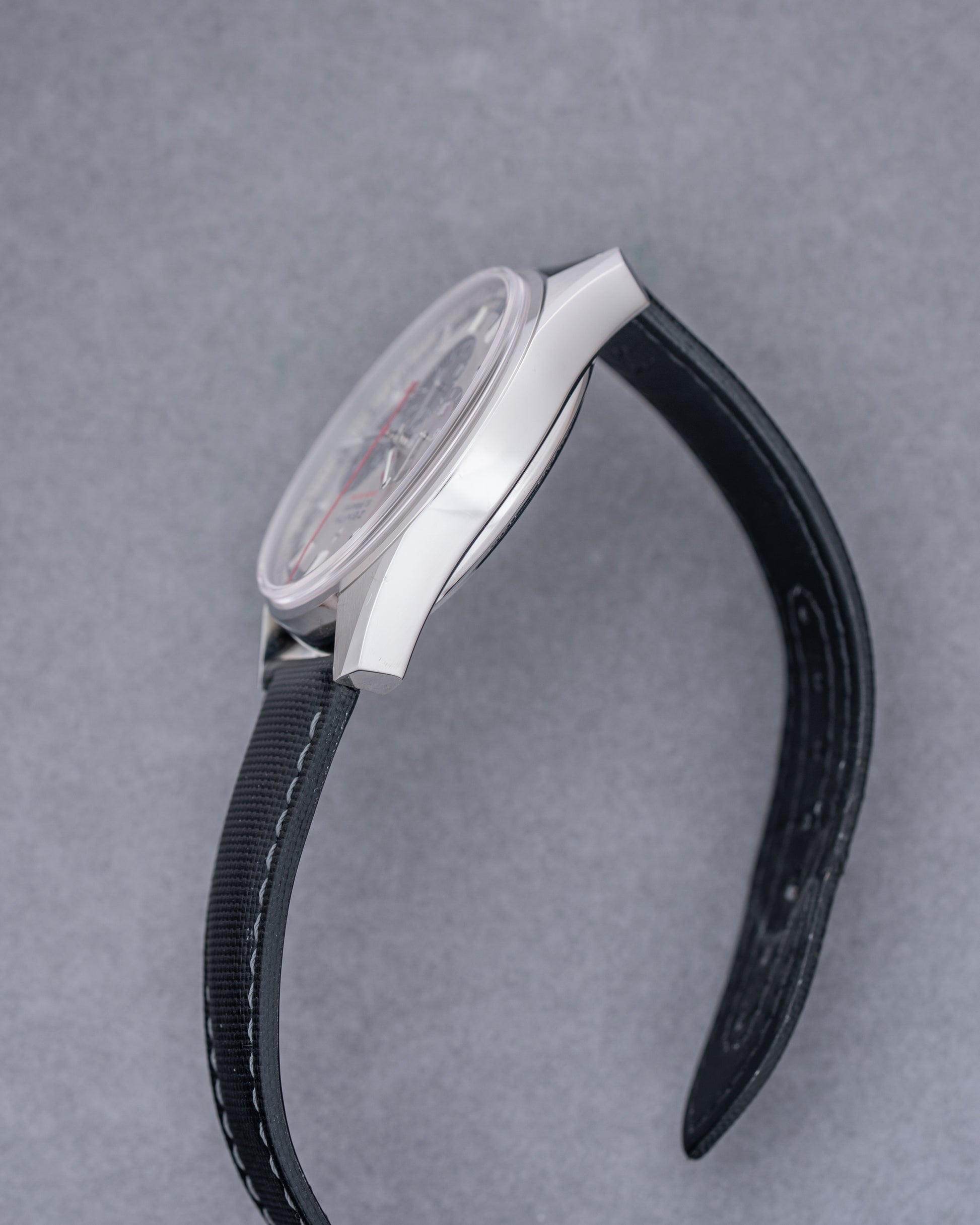 Striking 10th isn't your standard El Primero instead this is probably the coolest version ever. This El Primero isn't about tracking hours, it's about tracking a fraction of a second. And, inside it house 11 new components that allow the El Primero, which has had a frequency of 36,000 vibrations per hour since its launch over forty years ago, to take full advantage of this incredibly high frequency. The idea behind this watch is to have a center seconds hand that rotates around the dial not once every 60 seconds, but once every ten seconds, allowing the reader to measure 1/10th of a second accuracy with ease. Essentially, the sweeping hand here moves at 6x the pace of a normal chornograph's hand, and thanks to the clearly marked flange on the rim of the dial and a chronograph clutch-wheel that is perpetually engaged (even when the chrono is not running), stopping the 1/10th second hand and reading it precisely is incredibly easy.